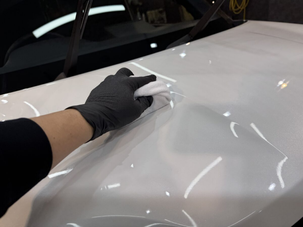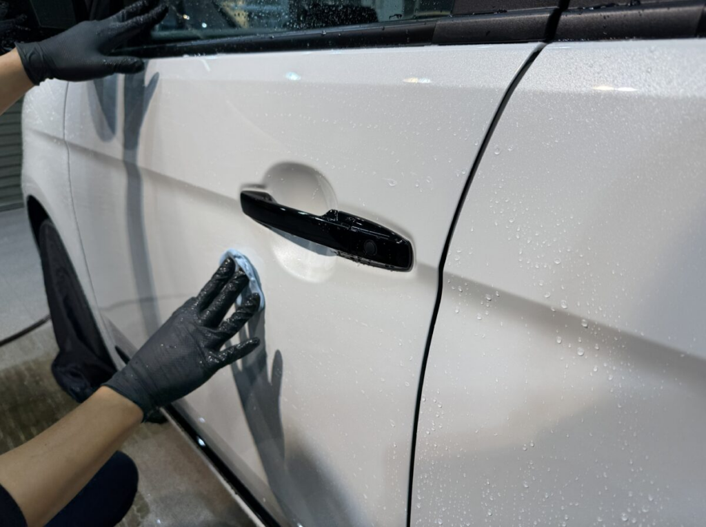 細部洗浄及びプレウォッシュを行い、表面の汚れを落としましたら、鉄粉除去作業を行っていきます。白色のお車ということもあり、目視で鉄粉の確認ができますが、手にも「ザラザラ」が伝わってきます。