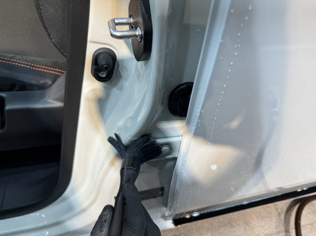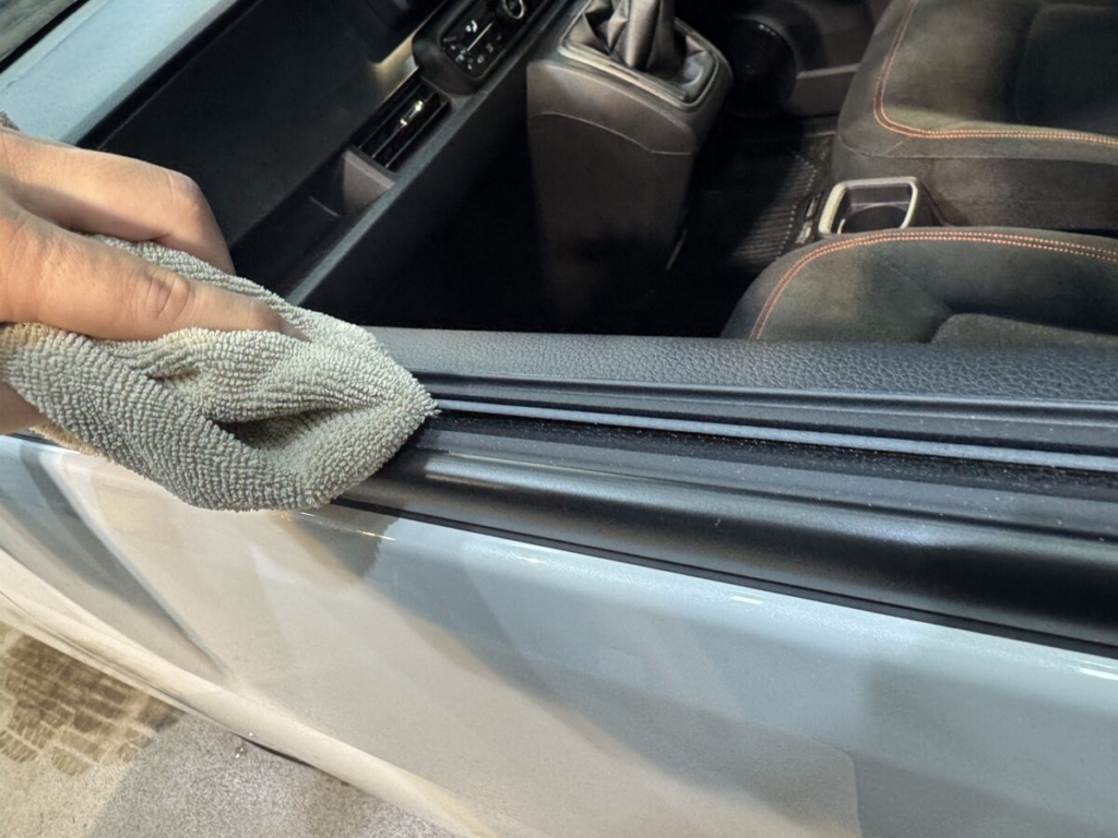 最後に全体を最終チェックし、窓の隙間などの汚れもキレイにクリーニングしていきます。新車時の艶感を間違いなく取り戻しています。