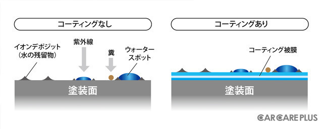 車の塗装は1番上にクリア層とよばれる層を塗ることで光沢を出していますが、そのさらに上にコーティングをすることでダメージからボディを保護する働きがあります。