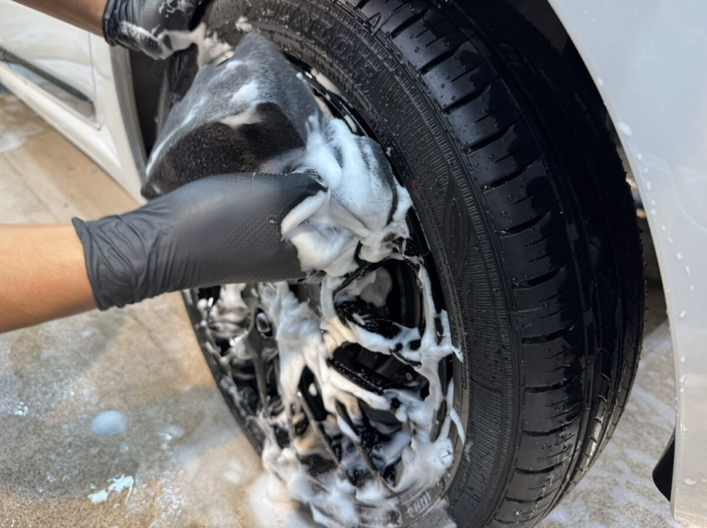 先ずはホイール洗浄から。裏側まで手が届くところは丁寧に洗浄を行います。同時に、タイヤハウス内もクリーニングを行い、最も汚れている下回りの汚れを掻き出し、落としていきます。